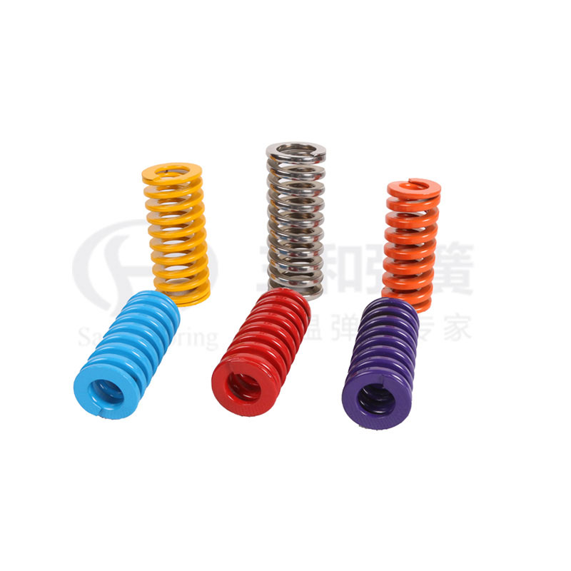 模具彈簧廣泛應用于沖壓模、金屬壓鑄模、塑膠模具以及其他彈性運動精密機械設備、汽車等領域。模具彈簧材質一般選用鉻合金鋼。鉻合金彈簧鋼具有耐高溫、剛性大、壽命長的特點。模具簧采用不同顏色區分彈簧的負荷,黃色為輕小負荷、銀灰為特輕負荷 、藍色為輕負荷、紅色為中負荷、綠色為重負荷、咖啡色特重負荷。